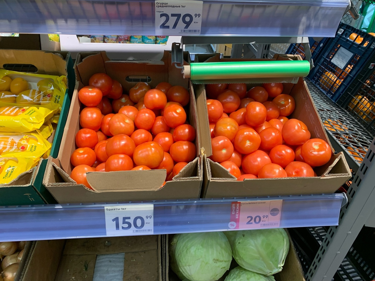 В магазине «Пятерочка» на Рабочей, 122 огурцы стоят 279,99 за килограмм, помидоры — 150,99. В продуктовом «Пятерочка» в Мирном переулке, 11/13 огурцы можно купить за 279,99, помидоры — за 150,99.