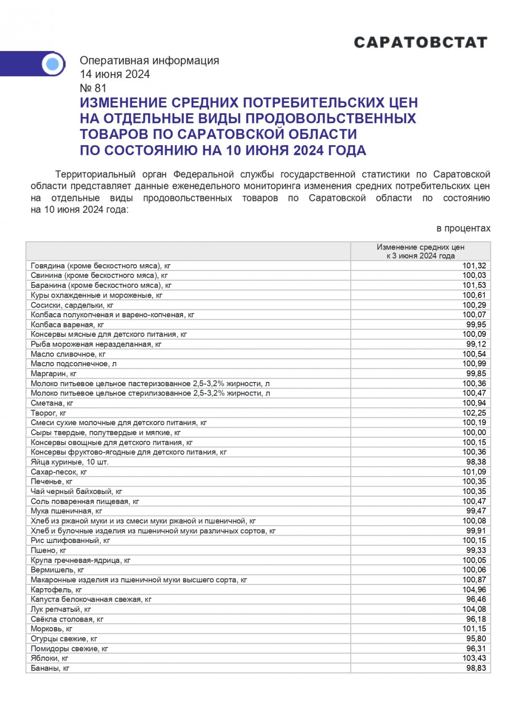 В Саратовской области за прошедшую неделю подорожали 7 видов продуктов, снизились цены на 6 видов. Данные еженедельного мониторинга изменения средних потребительских цен на отдельные виды продовольственных товаров опубликовал вчера, 14 июня, Саратовстат.