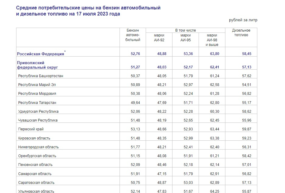 «За период с 11 по 17 июля рост цен на бензин автомобильный был зафиксирован в 82 субъектах Российской Федерации. Более всего он подорожал в Республике Дагестан — на 1,6%, Ямало-Ненецком автономном округе — на 1,5%, Астраханской области — на 1,2%», — констатируют статистики.