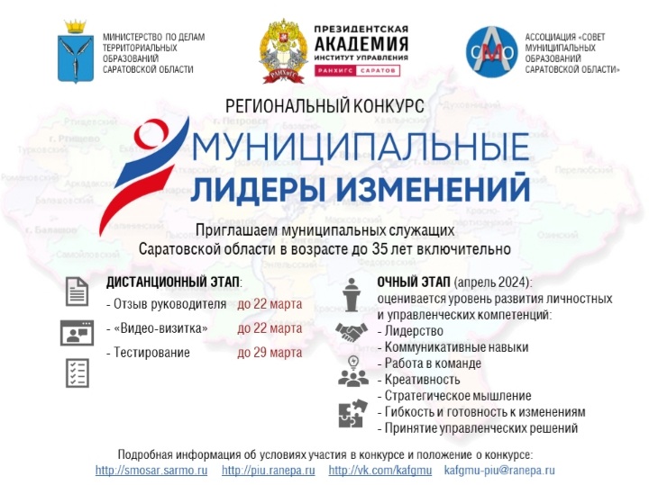В целях выявления и поддержки перспективных и инициативных муниципальных служащих, обладающих лидерскими качествами и управленческими компетенциями, повышения престижа профессии муниципального служащего, развития кадрового потенциала органов местного самоуправления проводится региональный конкурс среди муниципальных служащих «Муниципальные лидеры изменений - 2024».