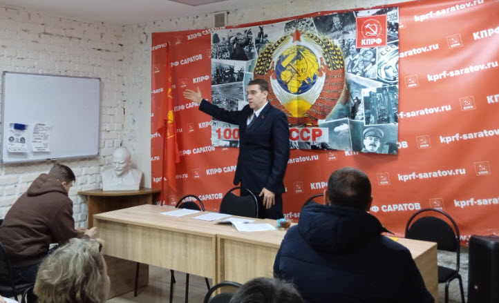 В помещении Саратовского горкома КПРФ состоялось очередное занятие политической учёбы, проводимой членом ЦК КПРФ Александром Анидаловым. На занятии присутствовали как сторонники партии, так и комсомольцы и опытные коммунисты.