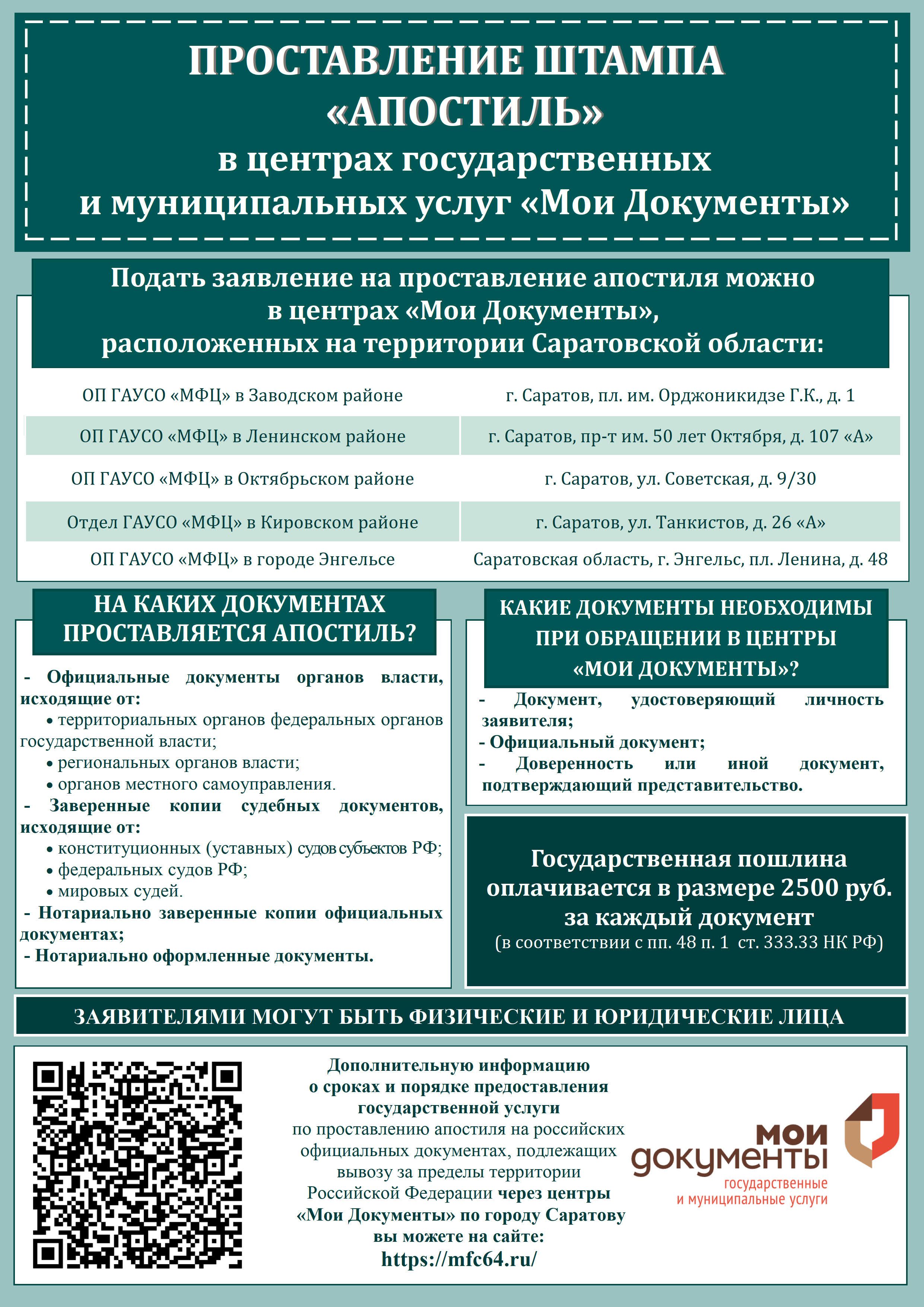 по проставлению апостиля на российских официальных документах, подлежащих вывозу за пределы территории Российской Федерации, доступна в центрах государственных и муниципальных услуг «Мои Документы», расположенных на территории города Саратова и города Энгельса Саратовской области