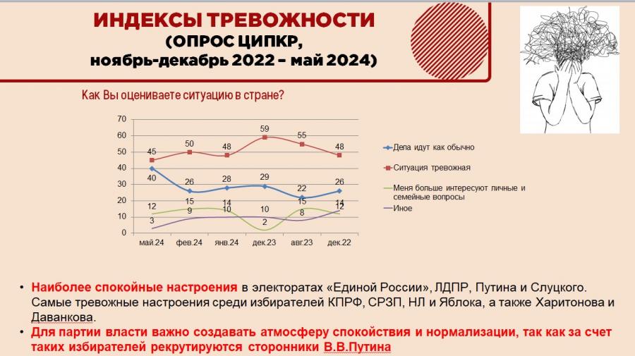 Свежие данные опросов ЦИПКР показывают, что тревожность в российской обществе хотя и остается высокой, но в последние месяцы снижается. Сейчас 45% граждан оценивают ситуацию как тревожную, а 40% — как обычную. Однако это снижение не снимает проблему сохраняющейся невротизации российского общества .