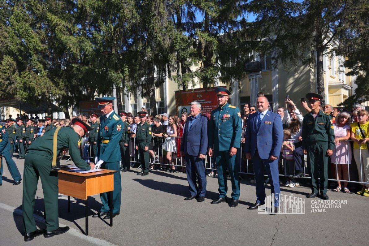 Парламентарий зачитал приветственное слово от Председателя областной Думы Михаила Исаева (фракция «Единая Россия»), поздравил курсантов от лица депутатов регпарламента и пожелал успехов в учебе и службе.