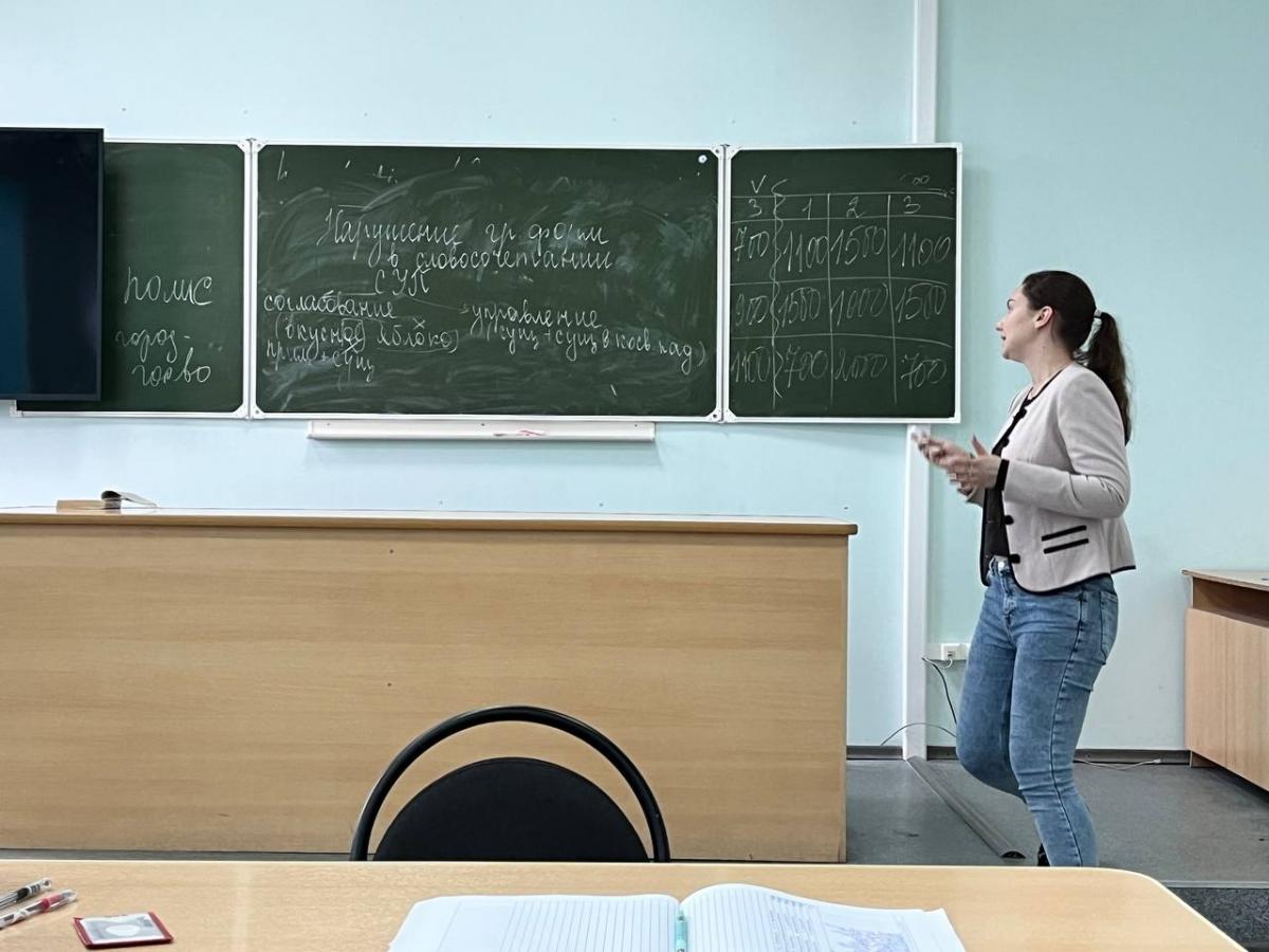 В преддверии Дня учителя молодые преподаватели кафедры "Иностранные языки и культура речи" Голишникова Алина Романовна и Балашова Дарья Юрьевна дали открытые уроки. Они проводили их со студентами первого курса Вавиловского университета на УК 1 и УК 2. Открытое занятие Голишниковой А.Р. было посвящено морфологическим нормам современного русского языка. Алине Романовне удалось показать обучающимся,что нарушение морфологических норм приводит к ошибкам, затрудняющим понимание высказывания, и свидетельствуют о низкой речевой культуре говорящего. Урок был построен согласно методике преподавания русского языка как родного. Вместе со студентами были рассмотрены особенности употребления и образования форм существительных, прилагательных, числительных, местоимений. Особенное внимание было уделено преподавателем образованию форм глаголов в повелительном наклонении и прошедшем времени, причастий и деепричастий. Знания, полученные на лекции, студенты отработали на практическом занятии, выполняя различные упражнения.В конце занятия была проведена артикуляционная гимнастика и прочитан текст, связанный с профессиональной направленностью обучающихся.