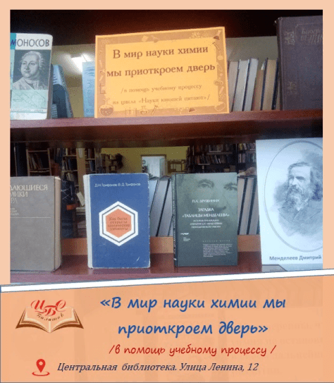 Вашему вниманию в Центральной городской библиотеке представлена книжная выставка «В мир науки химии мы приоткроем дверь» /в помощь учебному процессу/,
