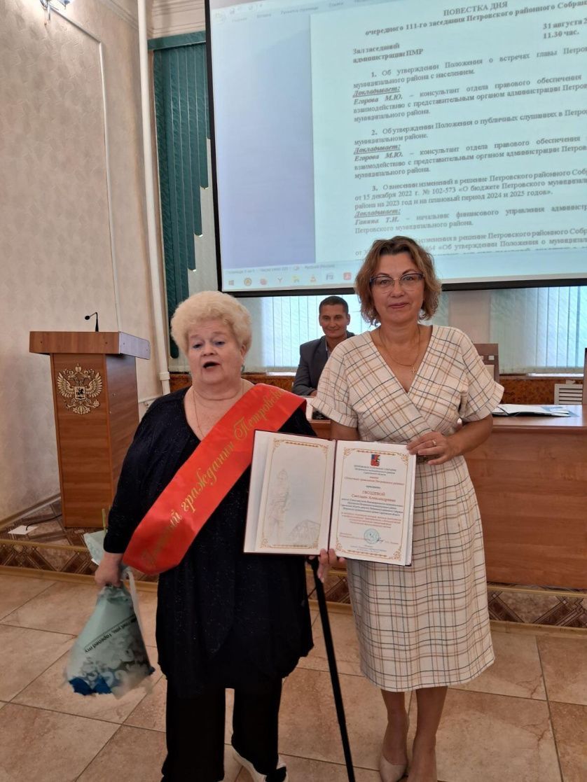 Сегодня на заседании депутатского корпуса председатель районного Собрания Ольга Лысенко вручила Светлане Гвоздевой свидетельство и ленту Почётного гражданина Петровского района. Решение о присвоении Светлане Александровне такого звания было принято 28 апреля.