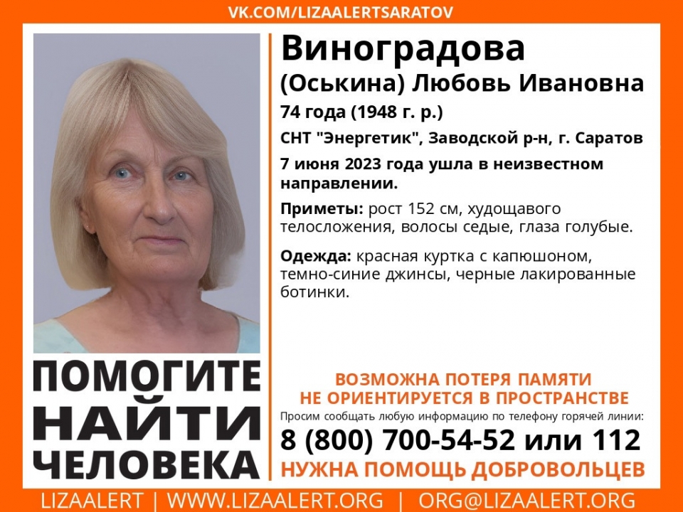 В Заводском районе Саратова ищут 74-летнюю Любовь Виноградову ( Оськину ). Об этом сообщает поисковый отряд "Лиза Алерт Саратов".