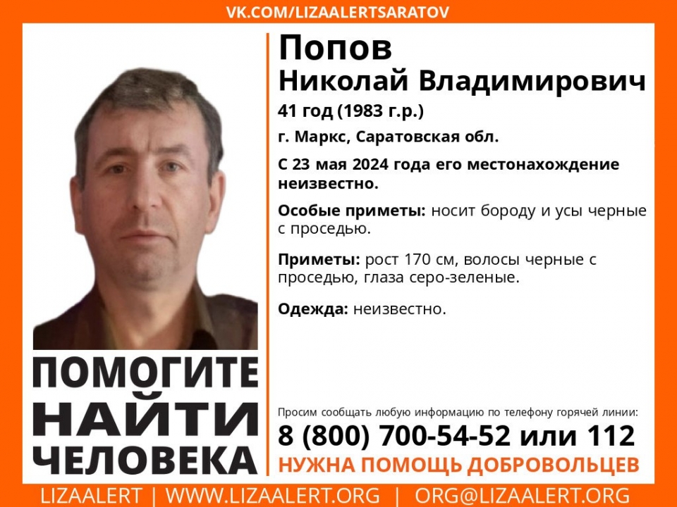 В Саратовской области три недели назад пропал 41-летний Николай Попов . Об этом сообщает "Лиза Алерт Саратов".