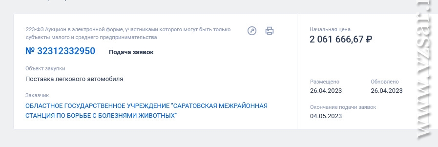 ОГУ "Саратовская межрайонная станция по борьбе с болезнями животных" объявило электронный аукцион на поставку легкового автомобиля.