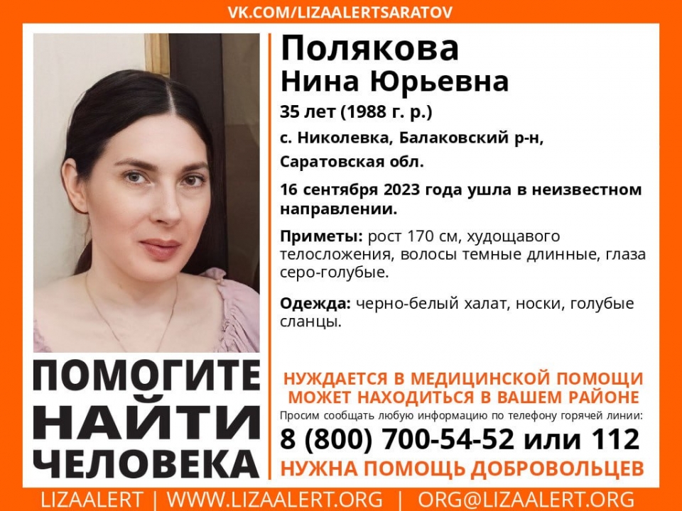 Вчера в Балаковском районе без вести пропала 35-летняя Нина Полякова. Об этом сообщает поисковый отряд "Лиза Алерт Саратов".