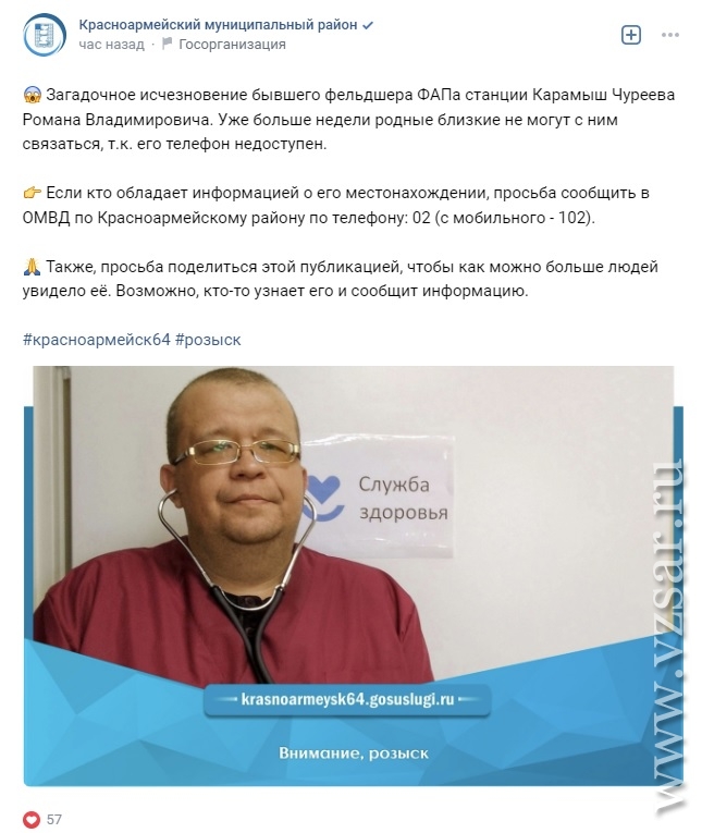 В Красноармейском районе Саратовской области при загадочных обстоятельствах пропал бывший фельдшер ФАПа станции Карамыш Роман Чуреев .