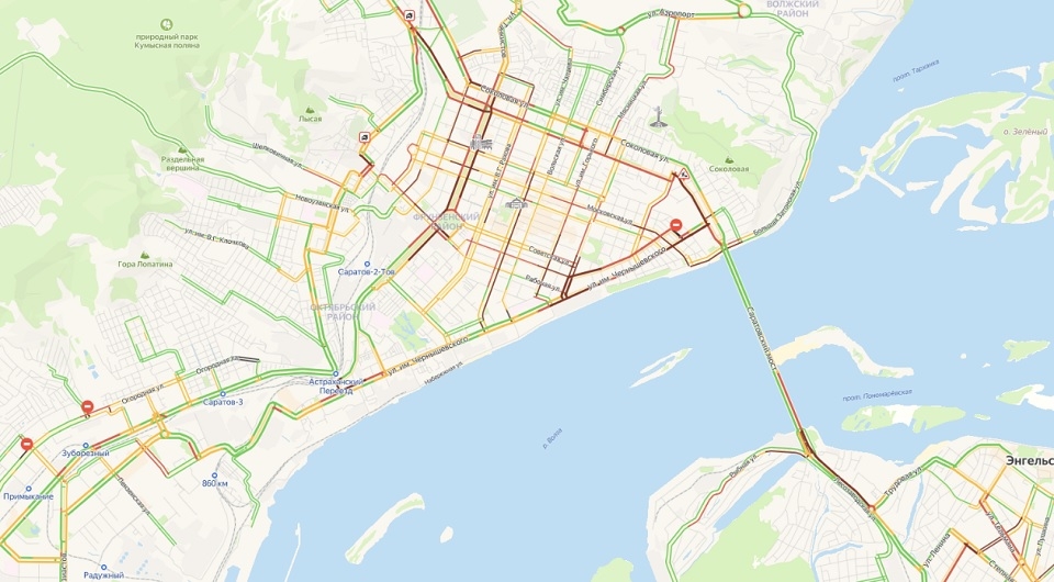 В настоящее время движение затруднено в районе железнодорожного вокзала и Сенного рынка, подъезды к мосту Саратов-Энгельс (с обеих сторон), а также центральная часть города.