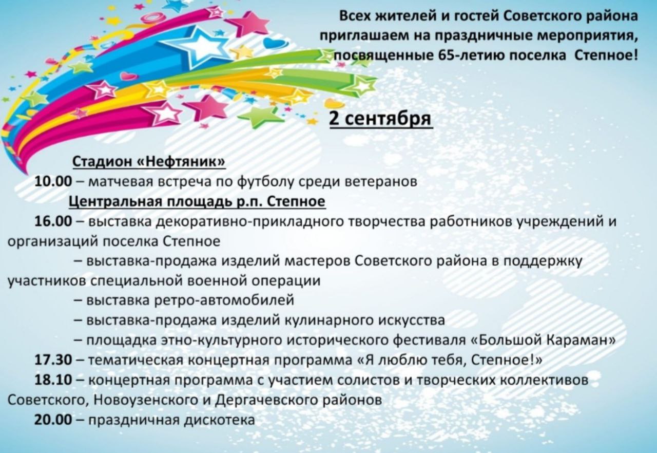 Всех жителей и гостей Советского района приглашаем на праздничные мероприятия, посвященные 65-летию поселка Степное!