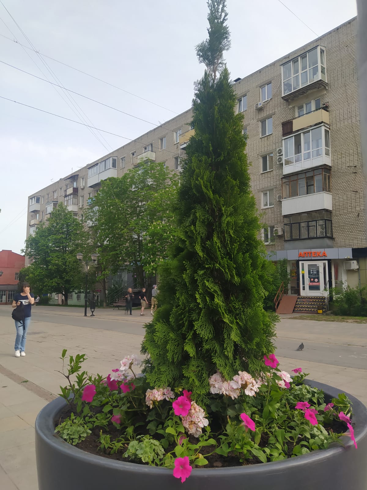 В вазонах высажены декоративные кустарниковые лиственные ива козья на штамбе и хвойные растения - туи, можжевельники, в дополнение оформлены цветочными культурами из однолетников.