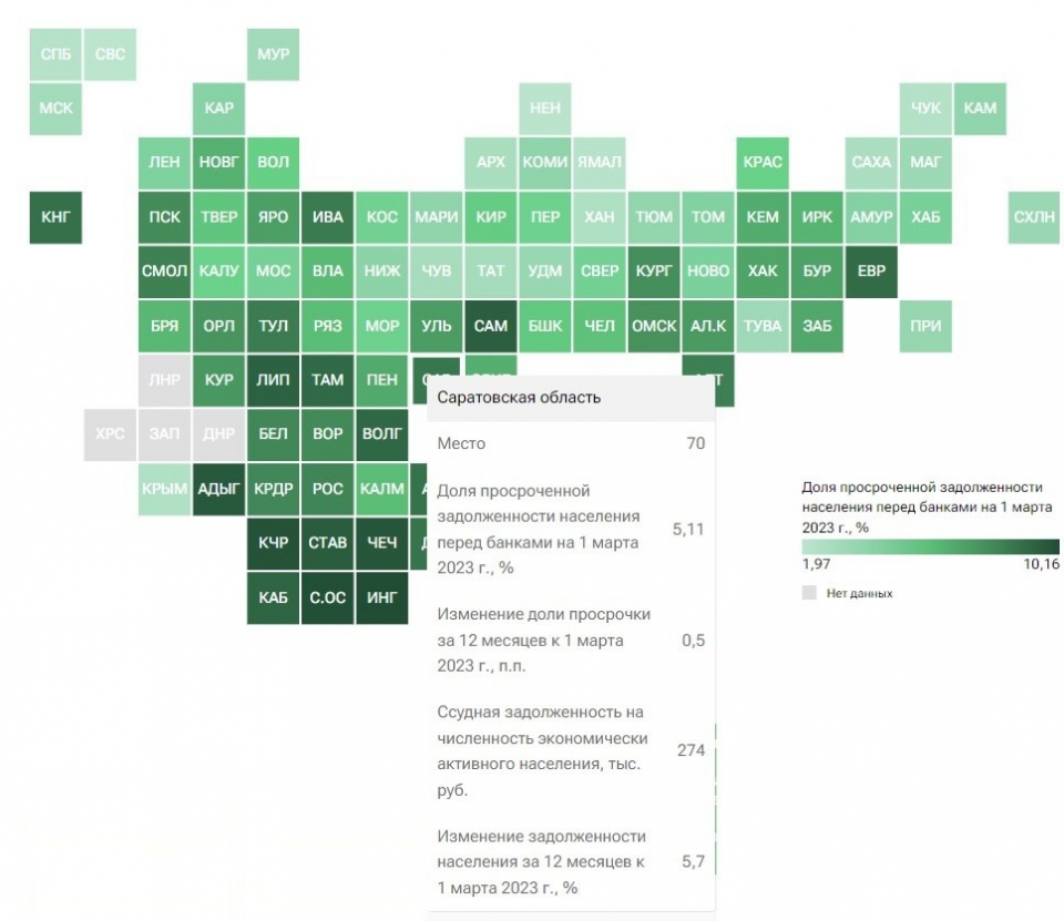 Саратовская область заняла в рейтинге 70-е место ( годом ранее она была 67-й ). Доля просроченных кредитов населения на 1 марта текущего года достигла 5,11% против 4,65% на аналогичную дату прошлого года, а средний объем кредитов на одного экономически активного саратовца - 274 тыс. рублей против 264 тыс. в 2022 году.