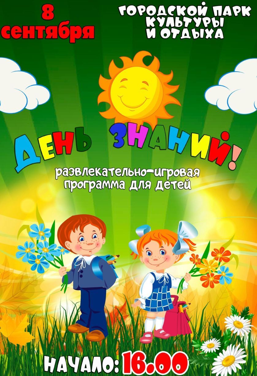 8 сентября в 16.00 районный Дом культуры приглашает девчонок и мальчишек в городской парк культуры и отдыха на развлекательно-игровую программу «День знаний».
