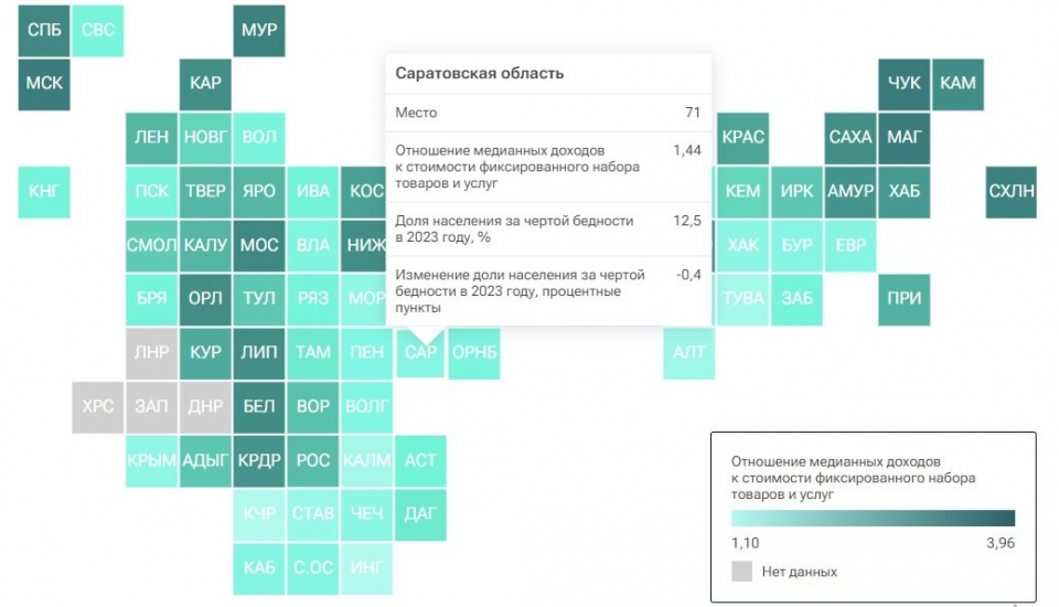 Несмотря на то, что за прошедший год абсолютные показатели Саратовской области улучшились (отношение медианных доходов к стоимости фиксированного набора товаров и услуг выросло), по сравнению с другими регионами ее достижения выглядят скромнее.