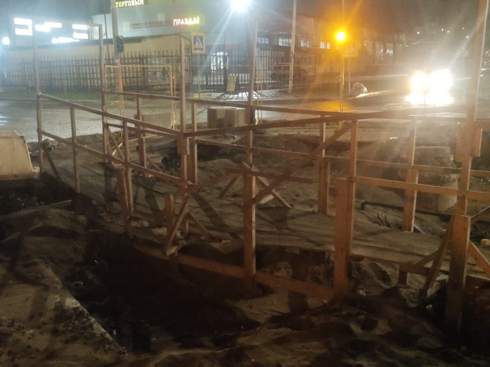 "Через разработанный котлован на улице Слонова сделали временные пешеходные переходные мостики. Состояние конструкций неудовлетворительное, в любой момент возможно обрушение.