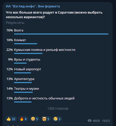 На этот раз в телеграм-канале "ИА "Взгляд-инфо". Вне формата" можно было выбрать несколько вариантов ответа. Мы учли замечания наших читателей, которым было трудно определиться с конкретным раздражителем.