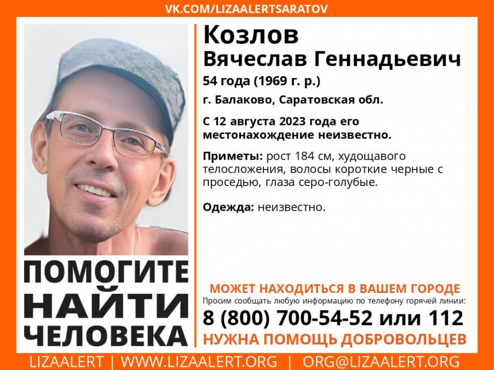 В Балакове без вести пропал 54-летний Вячеслав Козлов . Об этом сообщает поисковый отряд "Лиза Алерт Саратов".
