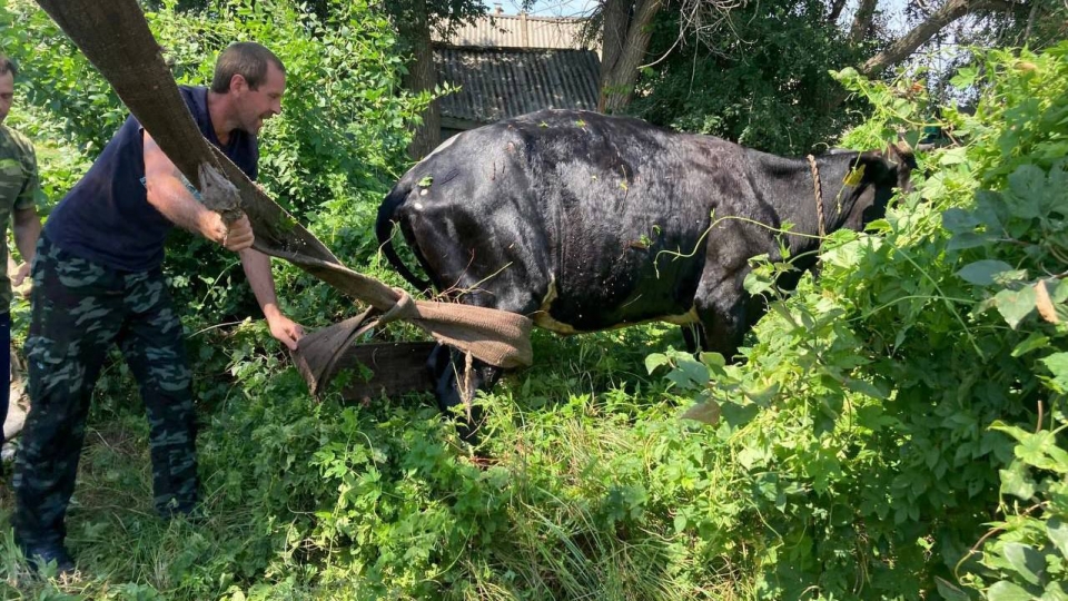 Прибывшие на место сотрудники областной службы спасения при помощи крана извлекли буренку из западни. К счастью, она не пострадала.