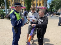 Госавтоинспекторы не только наказывали нарушителей двухколесного транспорта, но также и предотвращали нарушения Правил дорожного движения, раздавая яркие брошюры и разъясняя всем участникам дорожного движения о том, что необходимо сойти с велосипеда или электросамоката при пересечении проезжей части и о недопустимости езды на самокате вдвоем.