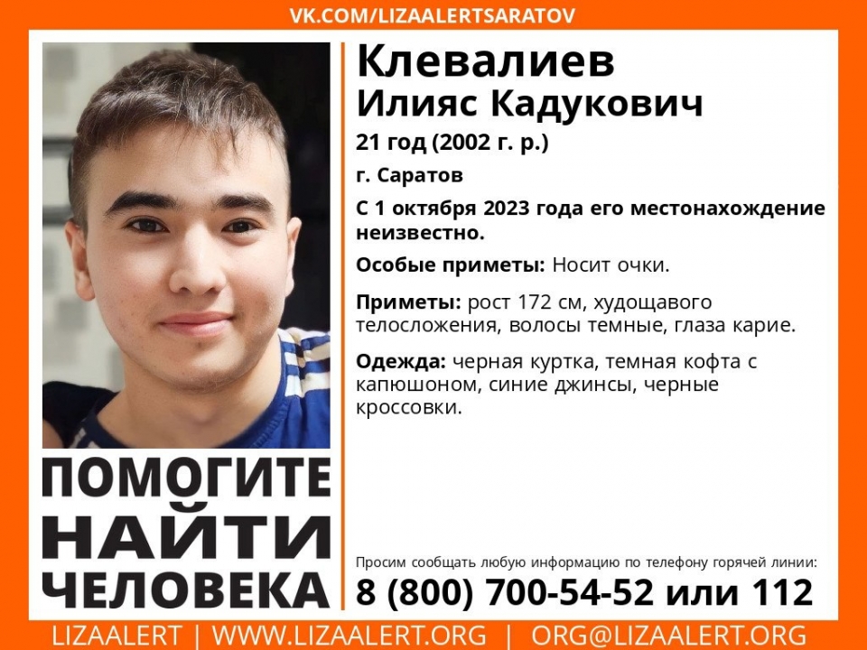 В областном центре больше месяца назад пропал 21-летний Илияс Клевалиев , сообщил вчера вечером поисковый отряд "Лиза Алерт Саратов".