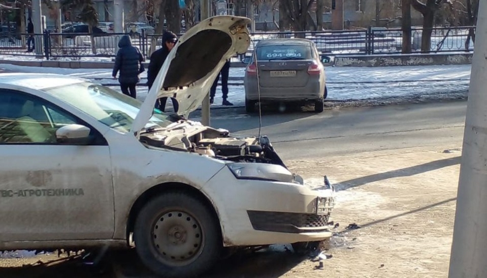 На пересечении улиц Вавилова и Астраханская столкнулись "Лада" и иномарка; при этом первый автомобиль от удара выехал на трамвайные пути.