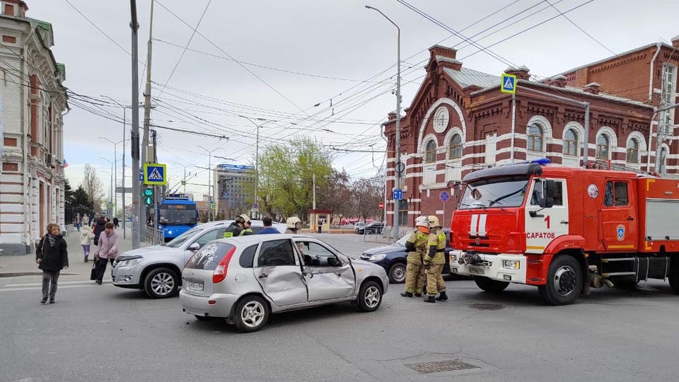 Сегодня в центре Саратова произошло ДТП с пожарным автомобилем. Он не разъехался с "Ладой Калиной" на перекрестке Московской и Горького, около областного правительства.