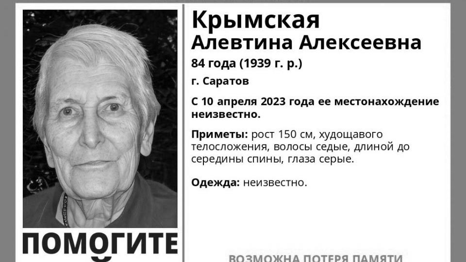 В Саратове нашли погибшей 84-летнюю Алевтину Крымскую . Сегодня об этом традиционно без подробностей сообщил поисковый отряд "Лиза Алерт Саратов".