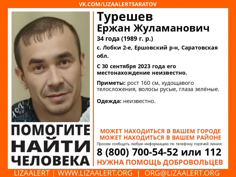 В Саратовской области с конца сентября прошлого года ищут без вести пропавшего Ержана Турешева . Об этом сообщает поисковый отряд "Лиза Алерт Саратов".
