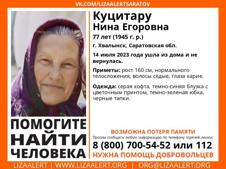В Хвалынске Саратовской области без вести пропала 77-летняя Нина Куцитару . Об этом сообщает поисковый отряд "Лиза Алерт Саратов".
