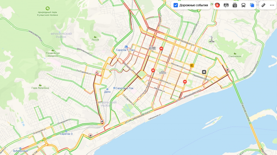 Сейчас стоит центр города, район СХИ, также все очень плохо на Большой Горной и Чернышевского по направлению к мосту "Саратов - Энгельс", а также на Политехнической.