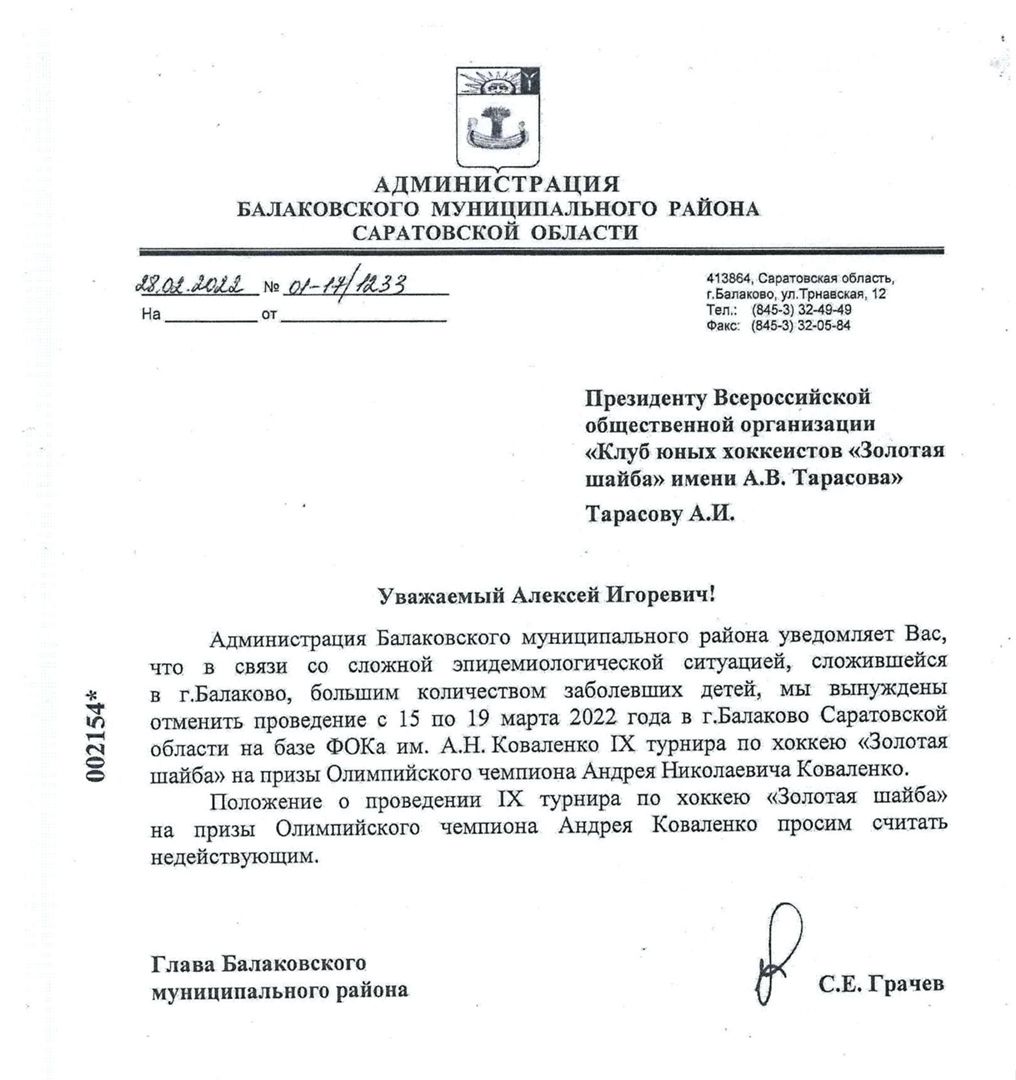 Но беда пришла откуда не ждали – от своих. Год назад, когда о ковиде говорили уже без прежней дрожи, новоиспеченный на тот момент глава района Сергей Грачев вдруг отменяет турнир, подписывая 28 февраля 2022 года постановление с фразой без всякой конкретики: «В связи с большим количеством заболевших детей…». Ну ладно, пусть. Главе виднее. И вот на днях тот же Грачев проговорился, что второй год подряд «Золотой шайбе» в Балакове не быть. Как так? Что же теперь, если не обнулившийся ковид? Давайте разбираться.