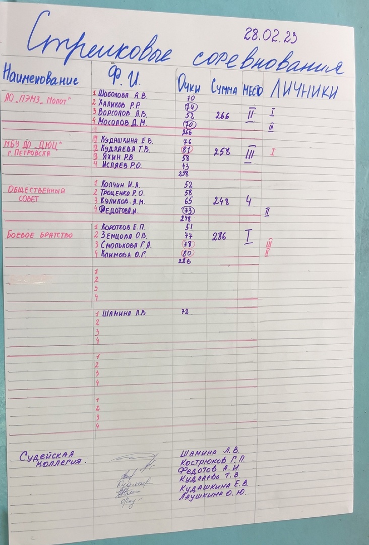 Первое место - у команды "Боевое братство" (286 очков), второе - у команды завода "Молот" (266 очков), третье - у команды детско-юношеского Центра (258 очков).