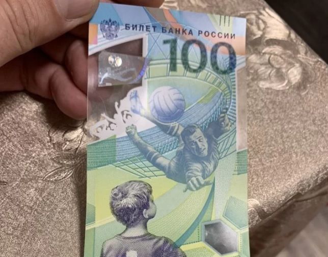 «На переднем плане лицевой стороны изображен держащий мяч ребенок. На втором плане мы видим легендарного советского вратаря Льва Яшина, который запечатлен в попытке поймать мяч. Основным графическим элементом оборотной стороны является футбольный мяч», - рассказал продавец о купюре в 100 рублей.