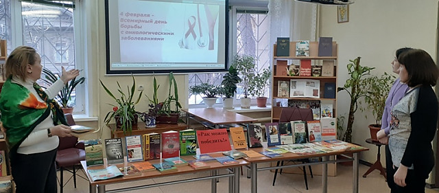 Всемирный день борьбы против рака отмечается ежегодно 4 февраля. Памятная дата провозглашена по инициативе Международного союза по борьбе с онкологическими заболеваниями (UICC) при поддержке Всемирной организации здравоохранения. В этот день в библиотеке прошло мероприятие, посвященное Всемирному дню борьбы против рака информ - досье «Рак: безнадёжных больных нет!». Для участников были подготовлены информационные видеоролики о проблематике онкологических заболеваний. А также была организована книжная выставка «Рак можно победить!». Из книг, журналов и информации интернет ресурсов представленных на выставке, наши читатели и посетители нашли ответы на многие вопросы: отчего появляется болезнь, можно ли ее предупредить, как питаться, как больному человеку вернуть веру в свои силы и многое другое.
