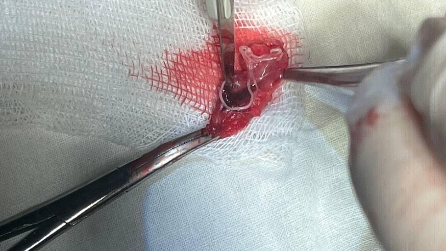 Мужчине сделали операцию. Из лобной области был выделен живой гельминт белого цвета, длиной 12 сантиметров.