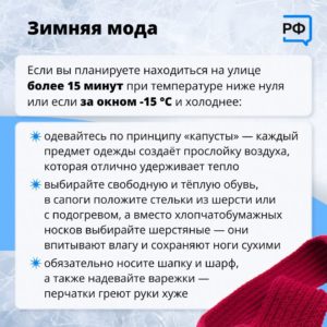 В мороз обязательно одевайтесь по погоде, иначе можно получить обморожение. При температуре ниже -10 °С достаточно 15 минут, чтобы появились его первые признаки.