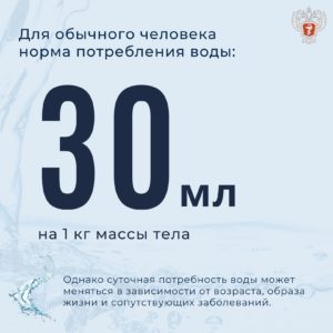В среднем взрослый человек, ведущий малоподвижный образ жизни, должен получать 1,5 л воды в день, однако её суточная потребность может меняться в зависимости от возраста, образа жизни и сопутствующих заболеваний.