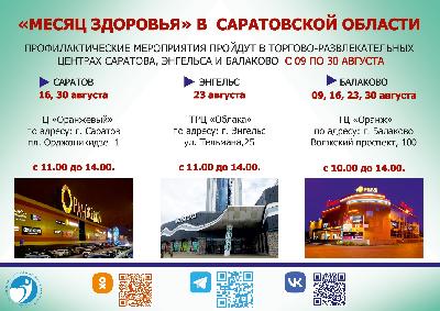 « Все желающие смогут бесплатно пройти скрининговое обследование, поучаствовать в мастер-классах по рациональному питанию и скандинавской ходьбе, посетить информационную площадку по профилактике сердечно-сосудистых заболеваний, зарядиться бодростью на физкульт-минутке, а 16 и 30 августа еще и получить консультацию кардиолога в ТЦ «Оранжевый» г. Саратов. Приглашаем всех желающих принять участие в информационно-профилактических мероприятиях в рамках проекта «Месяц здоровья». Ваше здоровье в Ваших руках» - отметил министр здравоохранения Саратовской области Олег Костин