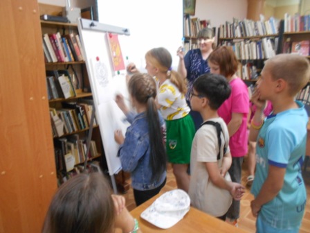 Разговор с ребятами продолжился об официальных символах нашей страны, которые объединяют всех людей живущих в стране, независимо от их национальностей. В завершение этого разговора ребятам было предложено раскрасить герб и флаг на скорость. Представители команд вышли к экспозиционной доске и под восторженные возгласы участников игры стали наносить цвета на шаблоны флага и герба.